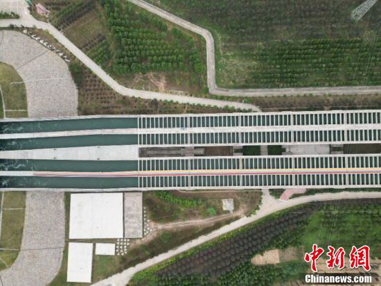 據(jù)悉,沙河渡槽工程根據(jù)結(jié)構(gòu)形式從上游向下游依次為,全長2838.1米的明渠段、全長1666m的沙河梁式渡槽段、全長3534米的沙河-大朗河箱基渡槽段、全長500米的大朗河梁式渡槽段、全長1820米的大朗河-魯山坡箱基渡槽段、全長1530米的魯山坡落地槽段以及50m長明渠渠道。圖為一泓“南水”北流途經(jīng)渡槽。