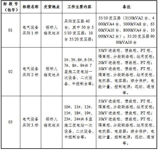 本次招標(biāo)共劃分3個(gè)電氣設(shè)備采購(gòu)標(biāo)段,具體工作范圍、供貨范圍等以“第五章 供貨要求”內(nèi)容為準(zhǔn)。主要采購(gòu)范圍見(jiàn)下表: